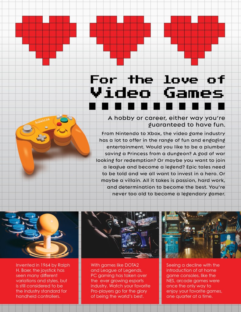 Serving as an introductory into the realm of Video Games, this one page newsletter is meant to be a small and eye catching design featured in a magazine.