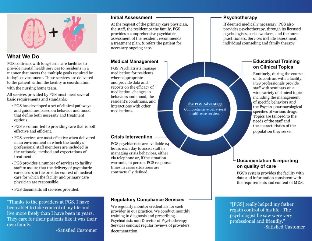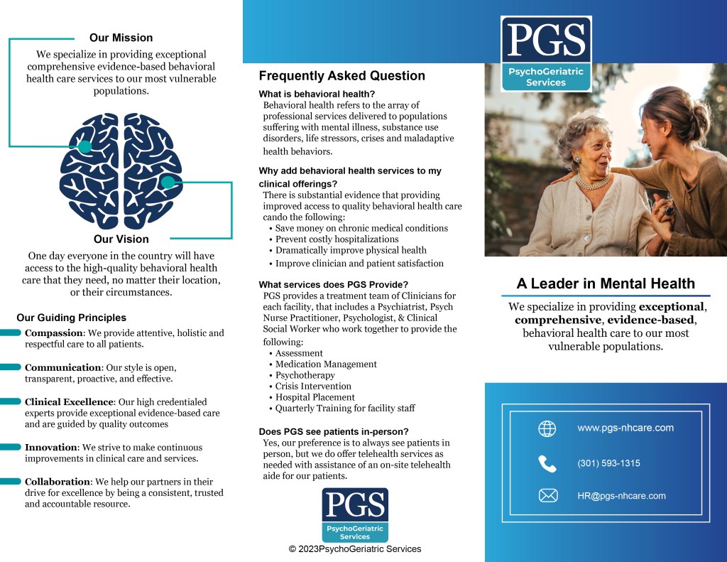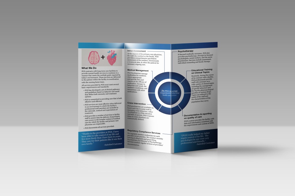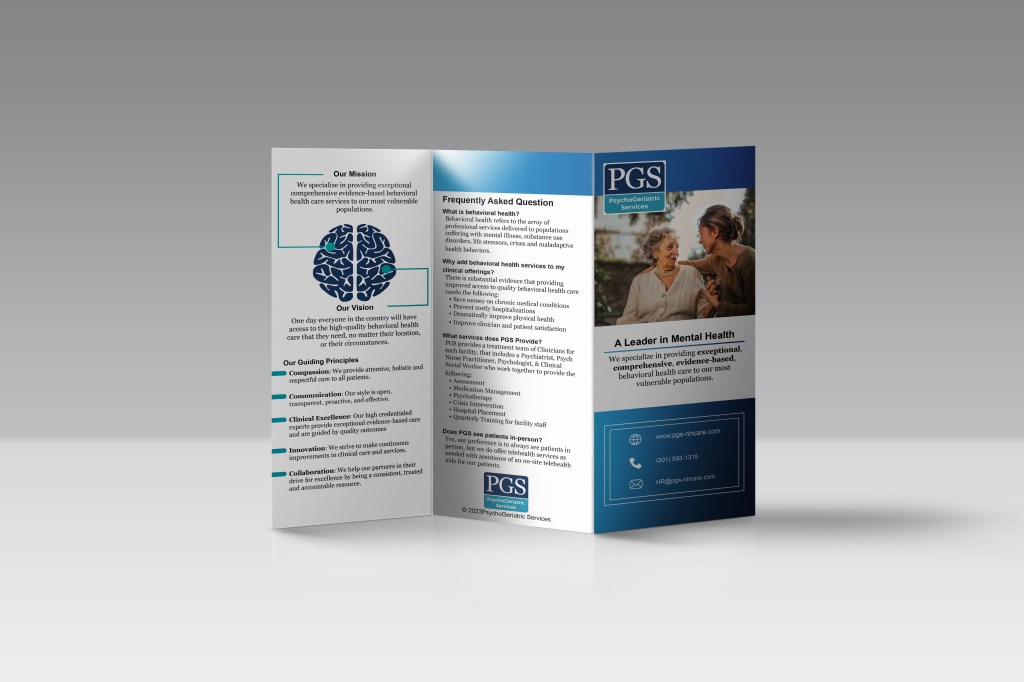 This Trifold Brochure is meant to be an introduction to PsychoGeriatric Services, the services they offer and frequently asked questions.