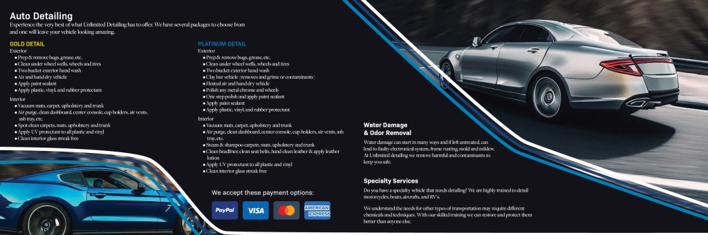 The project scope for this booklet was to create a catalog of services and offerings to Unlimited Detailing’s target audience.